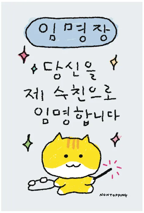 기존 수친 임명장에 고양이 ‘콩이’가 나오는데, 콩이의 다른 버전이 좋을지? 혹은 다른 캐릭터 (곰가드, 개구리) 가 좋을지?