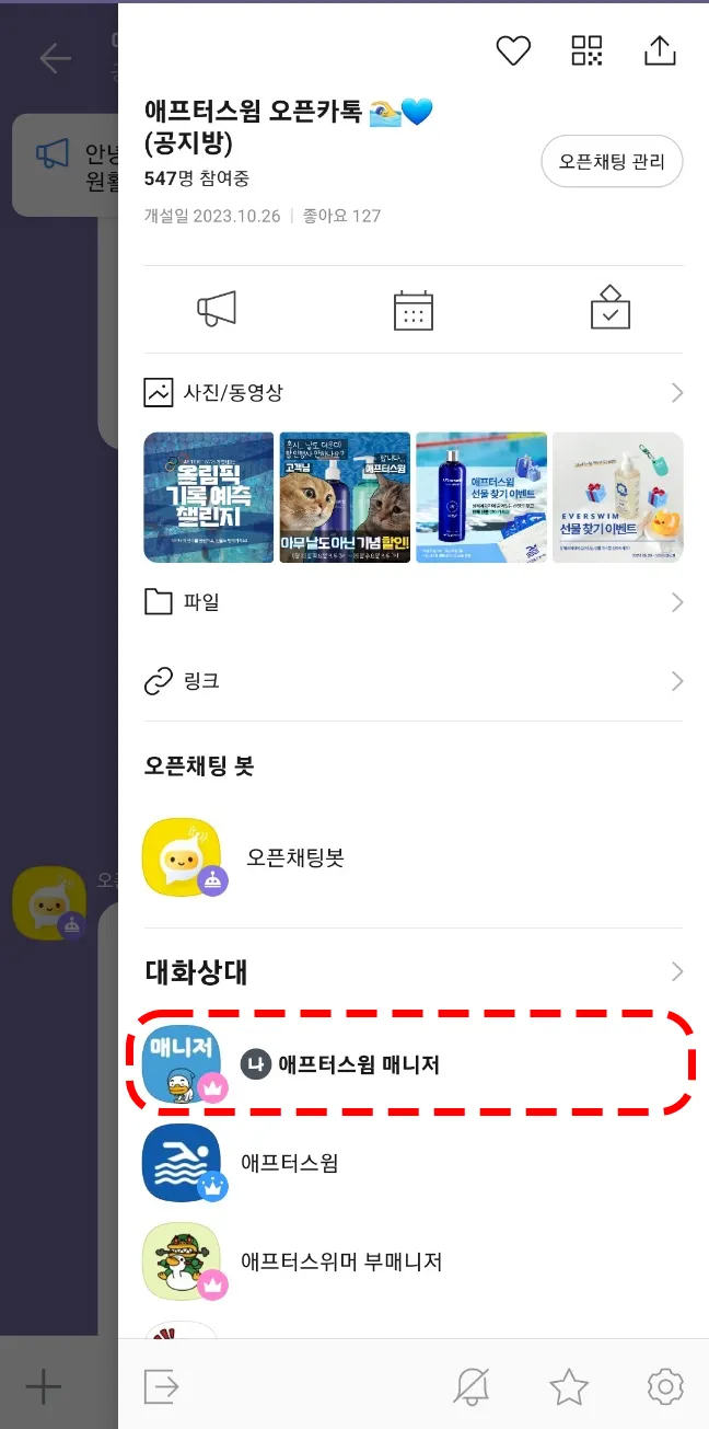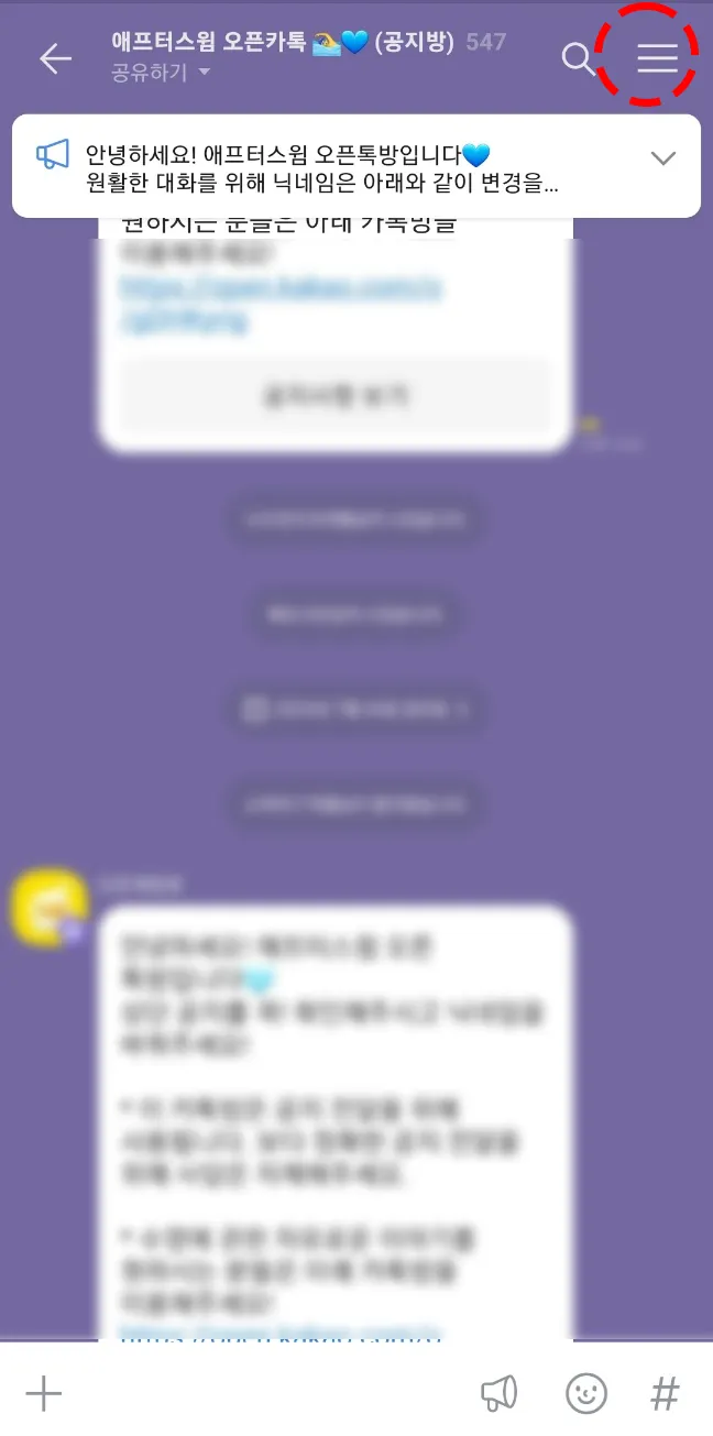 1. 카카오톡 오픈채팅방 오른쪽 상단의 메뉴를 눌러주세요.
