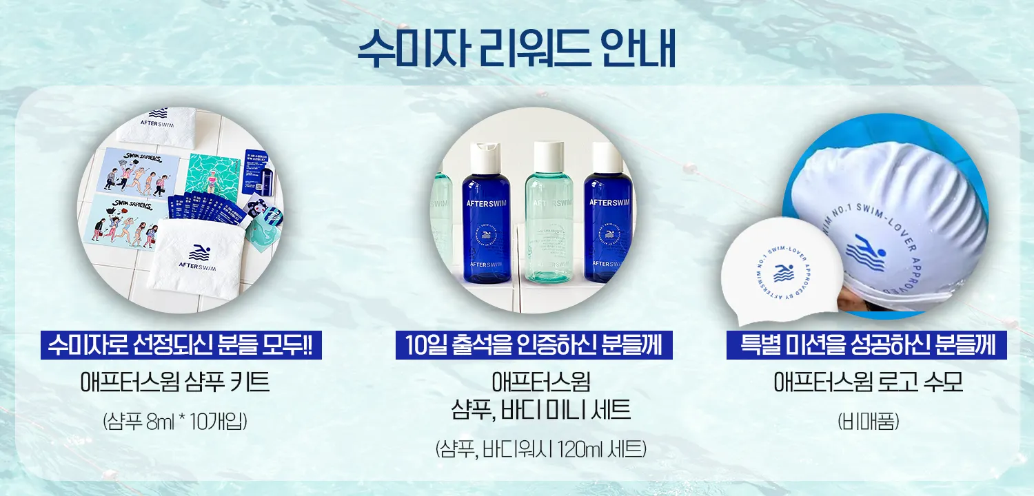 선정되신 분들 모두 : 애프터스윔 샴푸 키트 10일 출석을 인증하신 분들께 : 애프터스윔 샴푸, 바디 미니세트 (비매품) 특별 미션 수행 후 인증하신 분들께 : 애프터스윔 수모 (비매품)