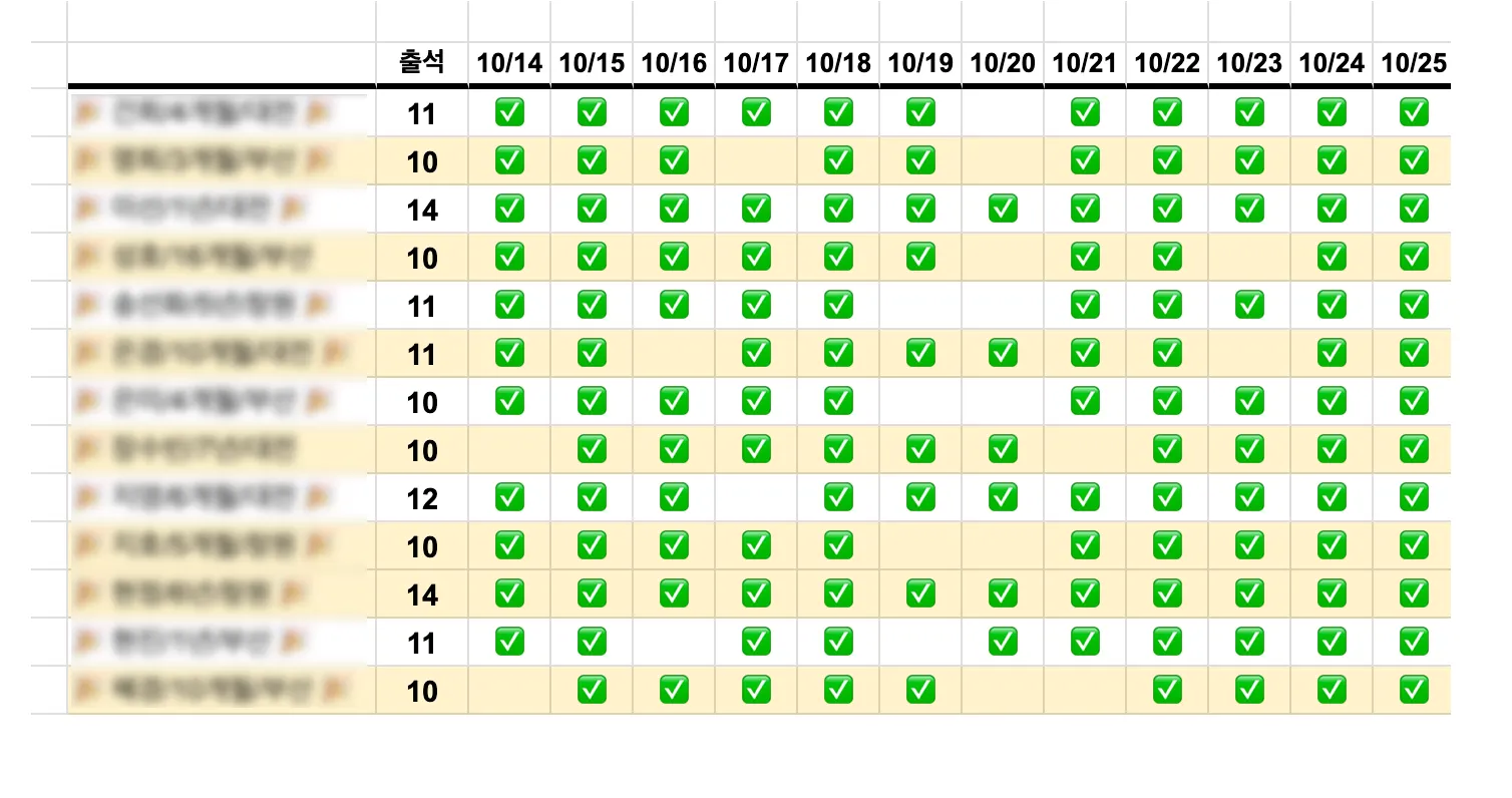 매일 출석현황을 체크하여 다음 날 오전, 매니저가 출석부를 전달드려요.