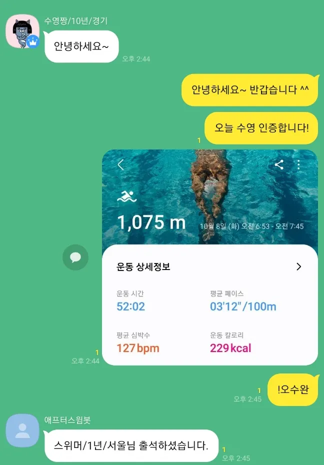 애프터스윔봇이 메시지 확인 후, 출석 확인 메시지를 보내드립니다.